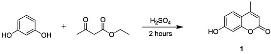 General procedure for 7-Hydroxy-4-methyl-chromen-2-one (1). Resorcinol (1.22 eq) was dissolved in concentrated H2SO4 (20 mL) at 0 °C, then ethyl acetoacetate (1.0 eq) was slowly added and the mixture was stirred at 0–5 °C for 2 h. At the end of the two hours, the reaction mixture was poured onto ice-water. Then, the solid was washed with water and recrystallized from EtOH. Finally, pure white solid 7-Hydroxy-4-methyl-chromen-2-one was obtained [22].