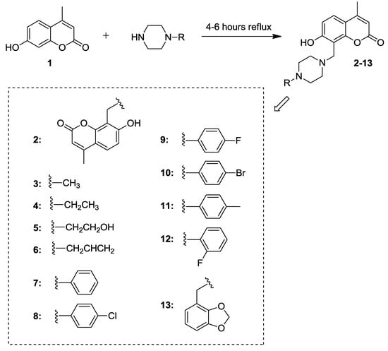General procudure for synthesis of 7-hydroxy-4-methyl-8 (piperazines)chromen-2-ones (2–13). Compound 1 (7-Hydroxy-4-methyl-chromen-2-one; 1.0 eq) was dissolved in 95% EtOH (5 mL), and then piperazine derivative(s) (R) (1.0 eq) and formaldehyde (0.2 mL) were added to the reaction medium. The reaction mixture was refluxed for 4–6 h. At the end of the 4–6 h, the reaction medium was cooled and then the solvent was evaporated in vacuo. Pale-yellow oils were obtained and further treated with a little amount of cool acetone. Then, the white solids were crystallized from acetone [23].