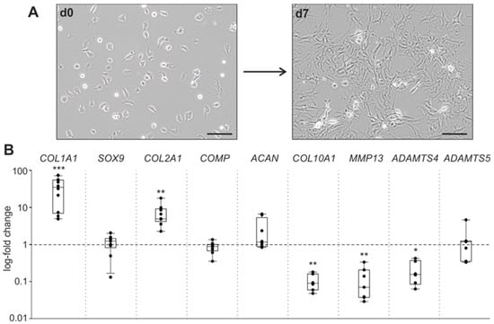 Chondrocyte phenotype shift during dedifferentiation under physioxia. (A) Change of human osteoarthritis (OA) chondrocytes from a polygonal to a fibroblast-like morphology after seven days under physioxic conditions (representative images of chondrocytes isolated from one OA patient, magnification 200×, scale bars represent 100 μm). (B) Gene expression changes of the transcription factor SOX9, ECM components, and ECM-degrading enzymes after seven days in monolayer culture under physioxic conditions compared to day 0 (gene expression on day 0 = 1, represented by the dashed line). All experiments were carried out with cells from 8–10 patients, using duplicates for each patient. Each circle shows the mean of the duplicates. Data are presented as box plots, where the boxes represent the 25th to 75th percentiles, the lines within the boxes represent the median, and the lines outside the boxes represent the 10th and 90th percentiles. Significant p-values against day 0 are presented as: * (p ≤ 0.05), ** (p ≤ 0.01), *** (p ≤ 0.001).