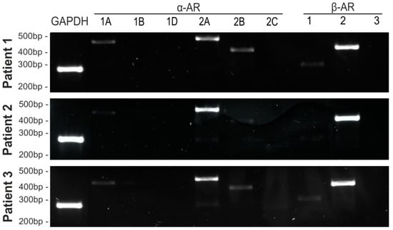 Adrenergic receptor profile of OA chondrocytes. Gene expression of different adrenoceptor subtypes in untreated primary chondrocytes isolated from three patients at day 0 (representative images of three OA donor cell isolations).