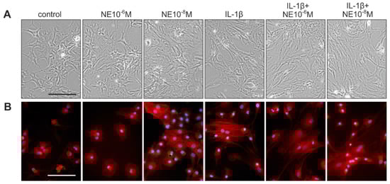 After seven days in culture, untreated chondrocytes showed the characteristic morphological changes towards a fibroblastoid shape, as detected by phase contrast microscopy and actin cytoskeleton staining (Figure 4A,B). Chondrocytes treated with NE alone (10−6 M and 10−8 M) did not differ morphologically from controls (Figure 4A,B). IL-1β treatment resulted in an accelerated morphological shift with more elongated cells (Figure 4A) and clearly visible phalloidin-stained stress fibers (Figure 4B), as described earlier [,]. Similarly, chondrocytes incubated with a combination of IL-1β and NE showed a morphology comparable to the IL-1β-treated group, with pronounced elongation of the cell shape (Figure 4A) and strong staining of actin stress fibers (Figure 4B). The age or the gender of patients did not influence the NE- and IL-1β-mediated changes in chondrocyte morphology and viability during dedifferentiation.