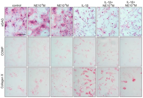 Effects of NE and IL-1β on ECM deposition. DMMB staining of sGAGs and immunohistochemical detection of COMP and type X collagen in OA chondrocyte cultures after seven days under NE or/and IL-1β influence and physioxic conditions (representative images of cells isolated form one OA patient). Scale bar represents 100 μm.