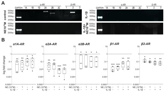 Expression of detected ARs significantly decreased after seven days of monolayer culture in untreated control groups and in NE-treated groups compared to freshly isolated chondrocytes at day 0. IL-1β alone or in combination with NE significantly inhibited the expression of ARs (Figure 7, p-values are indicated). In contrast, no changes in IL-1βR gene expression were observed (Supplementary Figure S2). Neither NE nor IL-1β alone or in combination with NE influenced IL-1βR expression compared to day 0 chondrocytes and to untreated controls at day 7 significantly (Supplementary Figure S2).