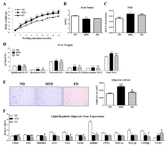 Effect of eriodictyol treatment on body weight (BW) (A), food intake (B), food efficiency ratio (C), white adipose tissue (WAT) weights (D), WAT morphology (200× magnification) and adipocyte cell size (E), and expression of adipocyte genes (F) in C57BL/6N mice fed with the high-fat diet (HFD). Data are presented as means ± SEM. Normal diet (ND; AIN-76) vs. HFD; * p < 0.05, ** p < 0.01, *** p < 0.001. HFD vs. ED (HFD + 0.005% ED); § p < 0.05, §§ p < 0.01, §§§ p < 0.001. Cd36, cd antigen 36; LPL, lipoprotein lipoase; SREBP1, sterol regulatory element-binding transcription factor 1; ACC, acetyl-CoA carboxylase; FAS, fatty acid synthase; SCD1, steroly-CoA desaturase 1; ADRB3, adrenoreceptor β3; CPT2, carnitine palmitoyltransferase 2; PGC1, peroxisome proliperator-acivated receptor γ coactivator 1; COX8β, cytochrome c oxidase subunit 8β; UCP1, uncoupling protein 1.