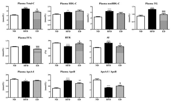 The results revealed that ED supplementation in HFD-fed mice significantly reduced plasma total-cholesterol (TC), triglyceride (TG), and free fatty acid (FFA) levels, as well as atherogenic index (AI) and apolipoprotein B (ApoB) levels. In addition, ED-supplemented HFD-fed mice showed markedly higher HDL-cholesterol-to-TC ratio (HTR) and ApoA-I/ApoB ratio (Figure 2).