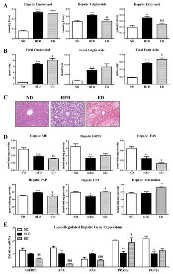 Moreover, mice in the ED group showed dramatically reduced hepatic TG and FA levels, relative to those in the HFD group, accompanied by markedly increased fecal excretion of cholesterol and FA (Figure 3A,B). The results of hematoxylin and eosin (H&E) staining revealed that the sizes and numbers of hepatic lipid droplets were decreased in the ED group compared to those in the HFD group (Figure 3C). ED significantly decreased the enzymatic activity of malic enzyme (ME), fatty acid synthase (FAS), and phosphatidate phosphohydrolase (PAP), and downregulated the gene expression of SREBP1, ACC, and FAS, which are known to regulate lipogenesis, in the livers of HFD-fed mice. In addition, ED markedly upregulated the expression of fatty acid oxidation-associated enzymes (carnitine palmitoyltransferase (CPT) and β-oxidation) and the PPARα gene in the livers of HFD-fed mice (Figure 3D,E).