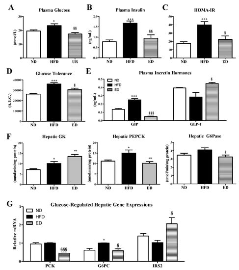 Effect of eriodictyol treatment on the plasma glucose (A) and insulin (B) levels, HOMA-IR (C), glucose tolerance (D), plasma incretin hormones (E), activities of hepatic glucose-regulating enzyme (F), and expression levels of hepatic glucose-regulating genes in C57BL/6N mice fed with the high-fat diet (HFD). Data are presented as means ± SEM. Normal diet (ND; AIN-76) vs. HFD; * p < 0.05, *** p < 0.001. HFD vs. ED (HFD + 0.005% ED); § p < 0.05, §§ p < 0.01, §§§ p < 0.001. HOMA-IR, homeostasis model assessment of insulin resistance; GIP, gastric inhibitory polypeptide; GLP-1, glucagon-like peptide-1; GK, glucokinase; PEPCK, phosphoenolpyruvate carboxykinase; G6Pase, glucose-6-phosphatase; PCK, PEPCK; G6PC, G6Pase; IRS2, insulin receptor substrate 2.