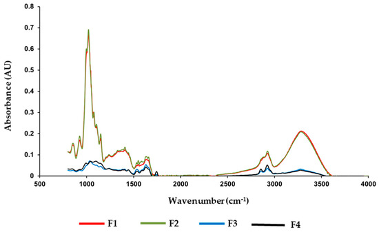 FTIR spectra of chickpea flour films. F1: 3% glycerol, pH 7; F2: 3% glycerol, pH 10; F3: 1% glycerol, pH 7; F4: 1% glycerol, pH 10.