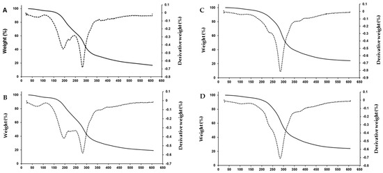 Thermogravimetric analysis (TGA) and derivative thermogravimetric (DTG) curves of chickpea flour films. (A) 3% glycerol, pH 7; (B) 3% glycerol, pH 10; (C) 1% glycerol, pH 7; (D) 1% glycerol, pH 10.