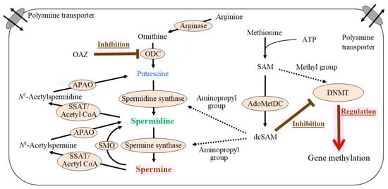 There is an overwhelming scientific consensus supporting the important role of epigenetic, especially gene methylation, changes in aging-associated pathologies and lifespan alteration [,]. Polyamine metabolism is closely associated with regulation of gene methylation (Figure 1). Polyamines are synthesized from arginine and S-adenosyl-L-methionine (SAM). SAM, produced from adenosine and methionine, is a methyl-group donor. Methylation of genes and proteins such as histones is directly involved in modulation of many biological functions. When methyl groups are added to DNA cytosines in gene promoter regions as an epigenetic modification, transcription of the corresponding gene is suppressed, and when methyl groups are removed from the promoter region, transcription is increased. DNA methyltransferases (DNMTs) are enzymes that catalyze transfer of a methyl group from SAM to a cytosine. The concentration of decarboxylated S-adenosylmethionine (dcSAM), which is produced from SAM by the enzymatic activity of S-adenosylmethionine decarboxylase (AdoMetDC), and also the dcSAM to SAM ratio, are closely associated with DNMT activity [].