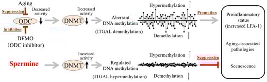 Aging is associated with enhanced demethylation of DNA in various organs and tissues in several animals and humans [,]. However, increased hypermethylation associated with age has also been reported in some genes [,]. The aging-associated changes in aberrant DNA methylation status, namely increased de-methylation in some areas and hypermethylation in other areas, are considered to be among the most important mechanisms underlying aging-associated pathologies. Our previous studies showed that D,L-alpha-difluoromethylornithine (DFMO)-induced ODC inhibition caused aberrant methylation in Jurkat cells, while spermine supplementation reversed this condition [,]. And, the site responsible for LFA-1 expression was demethylated and associated with increased LFA-1 protein levels after ODC inhibition, and spermine supplementation reversed the demethylation and increase of LFA-1 protein levels (Figure 2). Aging is associated with decreases in ODC [] and DNMT activities [], increased aberrant methylation status of entire genome, and enhanced demethylation of the LFA-1 promoter area in association with increases in LFA-1 protein levels [,,]. In a murine model involving chows with different polyamine concentrations, the methylation status of the entire genome in old mice fed regular chow showed an increase in aberrant methylation of entire genome in association with increases in LFA-1 protein levels. However, lifelong intake of high-polyamine chow prepared by adding synthetic polyamines prevented aging-associated increases in aberrant methylation and LFA-1 expression (Figure 2) [,].
