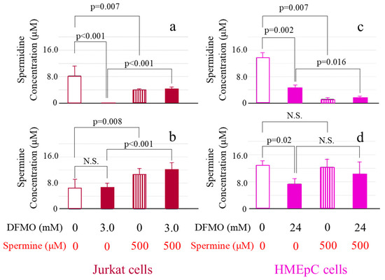 We established optimal concentrations for DFMO of 3.0 mM in Jurkat cells and 24 mM in human mammary epithelial cells (HMEpCs) and for spermine of 500 µM in both cell types. The intracellular spermidine and spermine concentrations in cultured Jurkat cells (controls = cells cultured in unsupplemented culture medium) were 8.27 ± 3.01 µM/1.0 × 106 cells and 6.45 ± 2.60 µM/1.0 × 106 cells, respectively. When Jurkat cells were cultured with 500 µM spermine, intracellular spermine concentration significantly increased to 10.63 ± 1.65 μM/1.0 × 105 cells (p = 0.008) (Figure 3b), whereas the spermidine concentration of 4.09 ± 0.28 μM/1.0 × 105 cells showed significant decrease (Figure 3a). In Jurkat cells cultured with 3 mM DFMO, spermidine decreased to below the detection limit (p < 0.001) (Figure 3a), whereas the spermine concentration was 6.76 ± 1.03 µM/1.0 × 106 cells, showing no significant decrease (p = 0.793) (indicated as N.S. in Figure 3b). After addition of 500 µM spermine to cells cultured with DFMO, both spermidine (4.35 ± 0.61 μM/1.0 × 105 cells) (Figure 3a) and spermine (12.20 ± 1.97 μM/1.0 × 105 cells) (Figure 3b) concentrations increased significantly (p < 0.001). When spermine and spermindine concentrations were compared between cells cultured with spermine and those cultured with DFMO and spermine, there were no differences in intracellular spermidine (p = 0.365) and spermine (p = 0.184) concentrations.