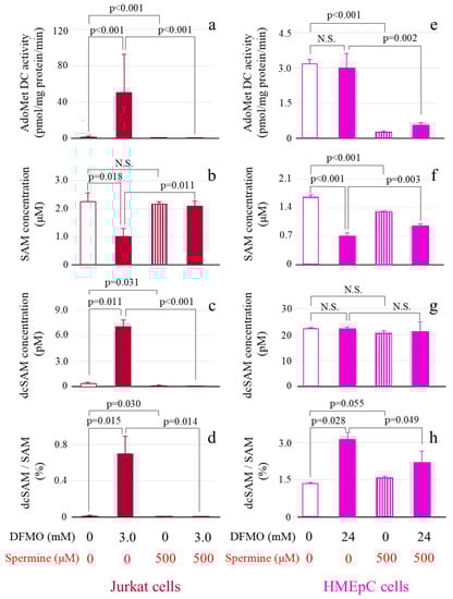 The effect of DFMO and spermine on AdoMetDC activity, SAM concentration, dcSAM concentration, and dcSAM/SAM ratio. AdoMetDC activity: Cells cultured for 72 h in different conditions were collected and the 14CO2 released when 14C-labeled adenosyl-L-methionine (carboxyl-14C) was converted to dcSAM by AdoMetDC was measured using a scintillation counter. SAM and dcSAM concentrations in Jurkat cells (1.0 × 106) and HMEpCs (1.0 × 105) were measured by HPLC. (a): AdoMetDC activity (pmol/mg protein/min) in Jurkat cells. (b): SAM concentration (μM) in Jurkat cells. (c): dcSAM concentration (pM) in Jurkat cells. (d): dcSAM/SAM ratio (%) in Jurkat cells. (e): AdoMetDC activity (pmol/mg protein/min) in HMEpCs. (f): SAM concentration (μM) in HMEpCs. (g): dcSAM concentration (pM) in HMEpCs. (h): dcSAM/SAM ratio (%) in HMEpCs. Data are shown as means and standard deviations of six samples (n = 6) for each culture condition. N.S.: not significant.