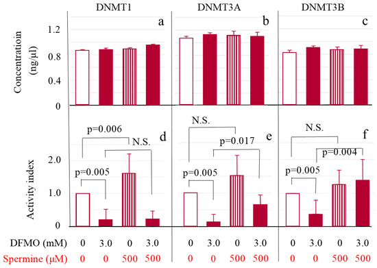 ODC inhibition suppressed DNMT 1, 3a, and 3b activities and spermine supplementation activated DNMT 3a and 3b without affecting their protein levels in Jurkat cells. Upper Figure: amount of DNMT subtypes. Nuclear proteins were extracted using 1.0 μL of extraction buffer per 1.0 × 106 Jurkat cells and each DNMT enzyme concentration in extracts was determined. (a): DNMT 1; (b): DNMT 3A; (c): DNMT 3b. Lower Figure: Enzyme activity per amount of each DNMT subtype. Activity was determined after adjustment to make DNMT protein concentrations equivalent. DNMT activities are shown using indexes that were calculated by dividing the measured activity by that of the control culture for each subtype. (d): DNMT 1; (e): DNMT 3A; (f): DNMT 3b. Data are shown as means and standard deviations of six samples (n = 6) in each culture condition. N.S.: not significant.