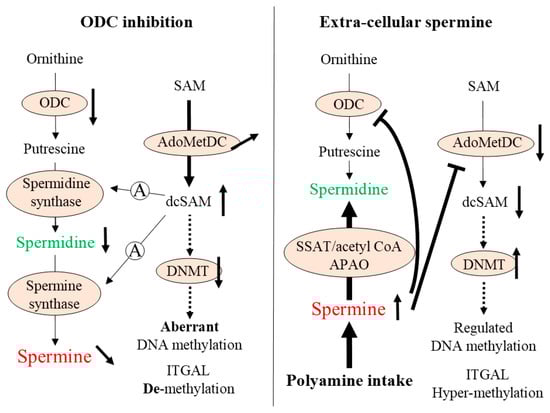 Summary of the study. (Left) When ODC is suppressed, AdoMetDC activity is either activated or unchanged. Decreased ODC results in decreased supply of putrescine for polyamine synthesis. The decreased supply of putrescine does not require an aminopropyl group (A in circle) from dcSAM. Therefore, surplus dcSAM inhibits DNMT 1, 3a, and 3b activities, resulting in aberrant methylation of the entire genome and demethylation of ITGAL. (Right) When spermine is supplied from extracellular sources as a result of increased polyamine intake, intracellular polyamine synthesis is suppressed. Spermidine is produced by the degradation of spermine via SSAT/Acetyl CoA and APAO, and therefore, no aminopropyl group (A in circle) is required for polyamine synthesis. This may result in strong inhibition of AdoMetDC (indicated by thick T-bar), resulting in a decrease of dcSAM concentration or dcSAM/SAM ratio. Decreased dcSAM re-activates DNMT 3a and 3b, resulting in regulation of the methylation status of the entire genome as well as hypermethylation of ITGAL. Hypermethylation of ITGAL suppresses aging-associated enhancement of the pro-inflammatory status by decreasing protein levels of LFA-1. Inhibition of aberrant DNA methylation may result in inhibition of various aging-associated pathological changes. Arrows indicate the metabolic pathway or flow of substances. T-bars indicate inhibitory activity. Dashed arrows indicate the consequence (downstream) induced by the change (upstream). ODC: Ornithine decarboxylase, SAM: S-adenosylmethionine, AdoMetDC: Adenosylmethionine decarboxylase, dcSAM: Decarboxylated S-adenosylmethionine, DNMT: DNA methyltransferase, SSAT: Spermidine/spermine N1-acetyltransferase; APAO: N1-acetylpolyamine oxidase, A in circle: Aminopropyl group.