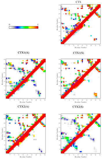 Probability maps for backbone–backbone contacts (below the diagonal) and sidechain–sidechain contacts (above the diagonal) as a function of residue number for CTX and its Abu- and Ser-substituted analogs. The color scale represents the relative probability of contact.