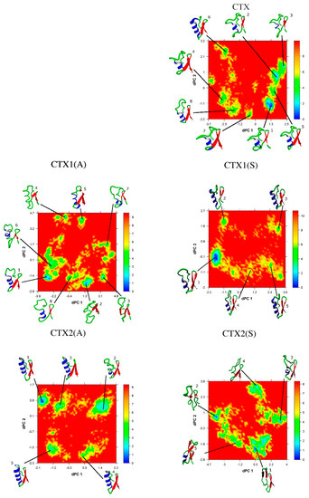 The lowest energy conformations were determined by projecting each trajectory onto the first 2 dihedral principal (dPC) components, as show in Figure 5. The lowest energy conformation of CTX was consistent with the 1H NMR structure as follows: α-helix from residues 15–20, 2 antiparallel β-sheets from residues 27–29 and 32–34, and 2 intervening turns from residues 22–25 and 30–31. There were 4 salt bridges: Arg14 and Asp17, Lys15 and Asp18, Arg25 and the C-terminus, and Lys27 and the C-terminus.