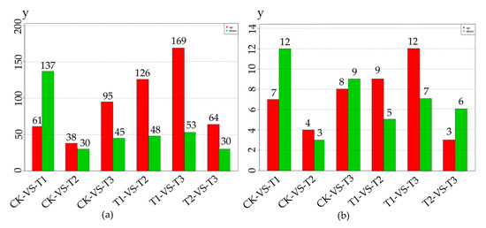 The number of differentially expressed miRNA in 4 methyl jasmonate (MeJA) treatment groups. The numbers on the column showed the quantity of upregulated (red) and downregulated (green) miRNA. (a) The number of differentially expressed total miRNA; (b) The number of differentially known miRNA. CK, T1, T2 and T3 represented 0 h, 24 h, 36 h and 48 h MeJA treatments respectively. The y-axis represents the number of miRNA.