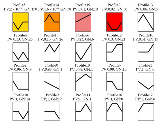 miRNA expression trend profiles among four MeJA treatment groups. PV: p-value; GN: the number of miRNA. The colour square frame denotes significant profiles (p-value ≤ 0.02). Each graph displays the mean pattern of expression (black lines) of the profile miRNA. The x-axis represents 0 h, 24 h, 36 h and 48 h MeJA treatment and the y-axis represents the log2 fold change of miRNA expression.