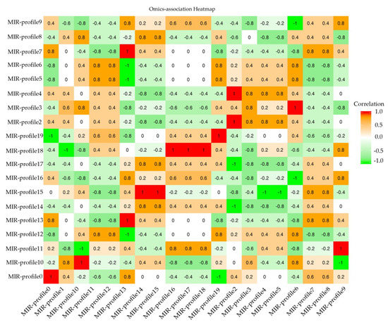 RNA-MIR profile association heatmap. Crosswises are RNA-profiles and lengthways are miRNA-profiles. Correlation < −0.50 is the negative RNA-MIR profile association in response to MeJA treatment.