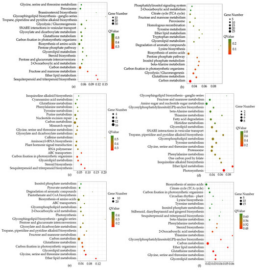 The top 20 of pathway enrichment using pairwise comparison. The size of the dots represent the number of genes. The color of the dot represents the Qvalue. CK, T1, T2 and T3 represent 0 h, 24 h, 36 h and 48 h MeJA treatment respectively. (a–f) is the description of CK-VS-T1, CK-VS-T1, CK-VS-T3, T1-VS-T2, T1-VS-T3 and T2-VS-T3 respectively. The x-axis represents rich factor. The y-axis represents the top 20 of pathway enrichment.