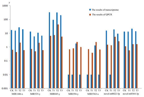 Real-time Quantitative PCR Detecting System (QPCR) verification and transcriptome of the miRNA. The blue column shows the data of miRNA transcriptome. The orange column shows the results of QPCR verification. CK, T1, T2 and T3 represent 0 h, 24 h, 36 h and 48 h MeJA treatment, respectively. The y-axis represents the relative expression of genes of transcriptom and QPCR.