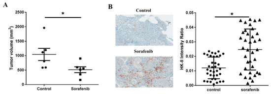 Next, we tested the effect of sorafenib on HK-II expression in a preclinical subcutaneous HCC murine model of SNU-761 tumors. Sorafenib administration was initiated two weeks after injection of SNU-761 cells (when tumors were palpable (50 mm3)). As shown in Figure 1A, sorafenib caused marginal inhibition of subcutaneous tumors four weeks after the injection of tumor cells (p = 0.048). Immunohistochemical analysis showed that HK-II expression was significantly increased in tumors after sorafenib treatment (p < 0.0001, Figure 1B).