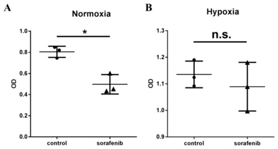 The upregulation of HK-II expression associated with sorafenib treatment prompted us to test the relationship between hypoxia and sorafenib, an anti-angiogenic agent, in more detail. Since hypoxia is reported to induce HK-II expression [16], we investigated whether hypoxia inhibited the effect of sorafenib on the proliferation of HCC in vitro. The human HCC cell line SNU-761 was cultured under normoxic and hypoxic conditions in the presence or absence of sorafenib [17]. Under the normoxic condition, sorafenib effectively inhibited cellular proliferation (p = 0.0074, Figure 2A). By contrast, the hypoxic condition led to significant cellular proliferation compared to the normoxic condition, regardless of the presence of sorafenib (2 μM) (Figure 2B).