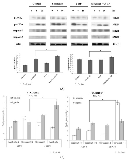 Other ER stress-mediated apoptotic markers, namely, GADD34 and GADD153 [18,19], were also markedly increased in cells treated with sorafenib + 3-BP, compared to sorafenib alone (Figure 3B). Taken together, these findings suggest that 3-BP might augment ER stress-dependent JNK activation in sorafenib-treated HCC cells, which thus leads to apoptosis of these cells.