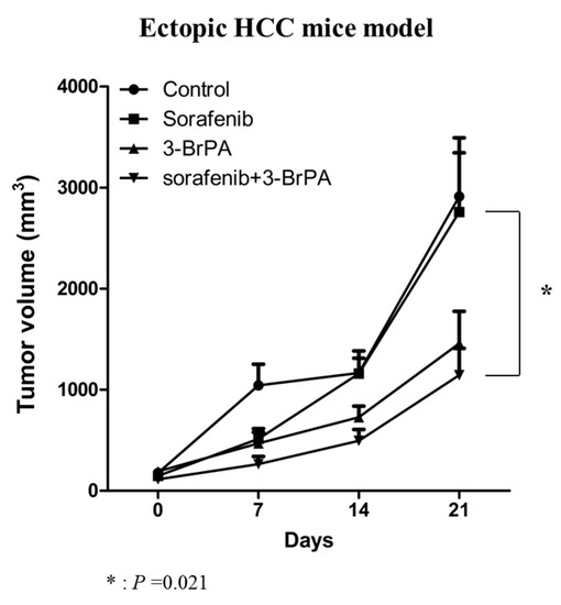 We then tested whether or not 3-BP treatment enhances the activity of sorafenib against HCC in BALB/c-nu/nu mice bearing subcutaneous SNU-761 tumors. Compared to the control animals, therapy consisting of sorafenib alone led to only mild suppression of tumor growth (Figure 4). By contrast, the combination therapy of 3-BP and sorafenib led to the obvious inhibition of tumor growth (Figure 4). After 28 days of treatment, the volumes of the tumors in the groups treated with sorafenib, 3-BP, or combined sorafenib + 3-BP were reduced to 66.5%, 44.6%, and 39.4%, respectively, of the mean tumor size of the untreated control group (p = 0.021, Figure 4). The synergistic effect was evaluated by NONMEM, based on the assumption that growth of the tumors was exponential. The growth rate constants were significantly larger for the tumors of the mice treated by sorafenib + 3-BP than for the untreated control mice, and mice treated by sorafenib, demonstrating that 3-BP and sorafenib acted synergistically to inhibit tumor growth (Table S1).