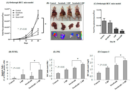 We then investigated whether or not 3-BP combined with sorafenib enhanced apoptosis in mouse HCC tumors. We used the TUNEL staining method to quantify apoptosis. The percentage of TUNEL-stained cells was significantly higher in the tumors of mice receiving sorafenib + 3-BP than in the tumors of mice receiving sorafenib alone (p < 0.05, Figure 5D). We then explored immunohistochemical staining with anti-JNK (p < 0.05, Figure 5E) and anti-caspase-3 (p < 0.05, Figure 5F). The intensity of caspase-3 and JNK expression was significantly higher in the tumors of mice receiving sorafenib + 3-BP than in the tumors of mice receiving sorafenib alone. These findings suggest that 3-BP augmented ER-stress-dependent JNK activation in sorafenib-treated HCC-bearing mice. The microscopy image of each immunohistochemistry is shown in Figure S3B.
