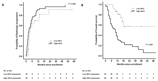 Survival analysis according to the HK-II expression level. (A) Time to progression. (B) Overall survival (OS).