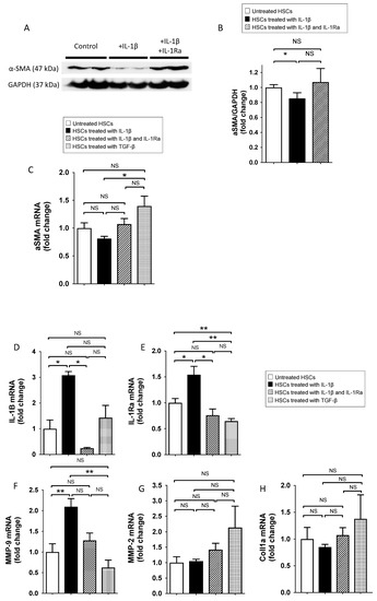 α-smooth muscle actin (α-SMA) expression by activated HSCs is a key feature of liver fibrosis [23]. Therefore, we investigated the effect of IL-1β on α-SMA mRNA and protein expressions in human HSCs in vitro, using immunoblotting and RT-PCR. Treatment of HSCs with IL-1β modestly decreased α-SMA protein expression levels in primary HSCs when compared to control (Figure 1A,B). This effect was prevented when IL-1Ra was added. Transforming growth factor-β1 (TGF-β1) (used as a positive control) induced increased α-SMA mRNA expression under these conditions (Figure 1C). Of note, IL-1Ra was not able to reverse the effect of TGF-β1 (Supplementary Figure S1), suggesting that the IL-1Ra effect is specific to IL-1β induction. We then sought to analyze whether IL-1β and IL-1Ra are regulated in HSCs, the key cell in the transition from inflammation to fibrosis [24]. IL-1β and IL-1Ra mRNA expressions were significantly upregulated in HSCs after exogenous IL-1β treatment (by 3.2- and 1.4-fold, respectively) (Figure 1D,E). Treatment with IL-1Ra prevented IL-1β effects and further reduced IL-1β and IL-1Ra expressions below basal levels. No effect on IL-1β and IL-1Ra expression was observed following HSC treatment with TGF-β (Figure 1D,E). Matrix metalloproteinases expression was previously demonstrated to be regulated by IL-1α in HSCs [25,26]. Therefore, we analyzed whether this regulatory effect persisted when using IL-1β. MMP-9 mRNA expression level was upregulated in IL-1β-treated human HSCs (by 2.1-fold) (Figure 1F). This effect was prevented when cells were treated with IL-1Ra. Again, TGF-β had no effect. MMP-2 and collagen type I expression was not significantly modified following IL-1β and L-1Ra treatment (Figure 1G,H). Overall, these results indicated that IL-1β reduces stellate cell activation and enhances IL-1β, IL-1Ra and MMP-9 production in vitro.
