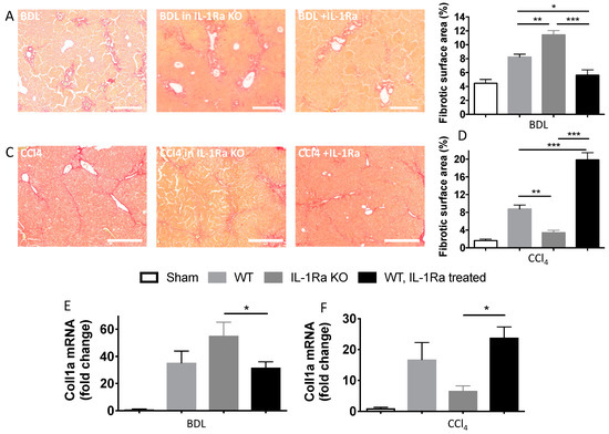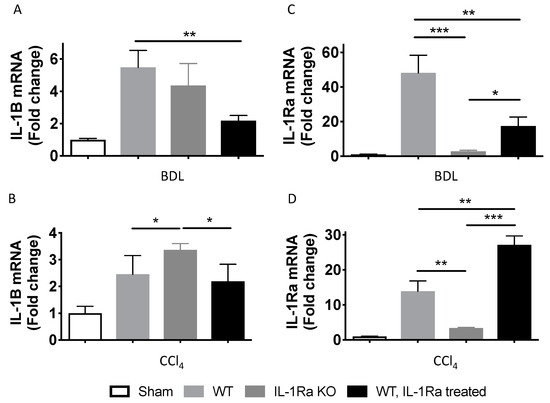 We analyzed liver IL-1β and IL-1Ra mRNA expression levels using RT-PCR, in both BDL- and CCl-4-induced liver fibrosis models. In both models, liver IL-1β mRNA expression levels were significantly upregulated in all mice groups following liver fibrosis induction (Figure 2A,B). IL-1β expression was the highest in either WT mice (BDL model) or in IL-1Ra KO mice (CCl-4 model). IL-1β expression was the lowest in IL-1Ra treated mice in both models. As expected, IL-1Ra expression was absent in IL-1Ra KO mice in both fibrosis models (Figure 2C,D). In line with gene expression findings, corresponding elevations of serum IL-1β and IL-1Ra were found in the BDL model (Figure 2E,F) (not done in the CCl-4 model). Comparison between WT and KO baseline IL-1β and IL-1Ra mRNA levels in sham animals without fibrosis induction is provided in Supplementary Figure S3. Overall, these results showed that IL-1β and IL-1Ra are upregulated during BDL-or CCl-4-induced liver fibrosis.