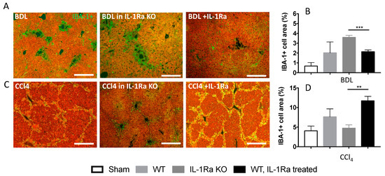 We then investigated the activation of Kupffer cells during liver fibrosis in the two models by quantifying the ionized calcium binding adaptor molecule 1 (IBA-1) [27,28] on liver sections (Figure 5). The results varied along with fibrosis intensity in each model, respectively. In the BDL model, the numbers of liver IBA-1 expressing cells were significantly increased in IL-1Ra KO mice compared to WT mice or IL-1Ra treated mice (Figure 5A,B). The opposite situation was observed in the CCl-4 model; a lower level of activation was observed in the IL-1Ra KO group compared to the two other groups (Figure 5C,D). Overall, these results are consistent with those observed in fibrosis level variations and further highlight model specific effects during IL-1Ra modulation.