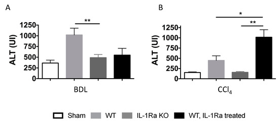 Serum alanine aminotransferase levels (ALT). Serum ALT levels were measured in sham mice and mice following 2–4 weeks BDL (A) or 6 weeks CCl-4 treatment (B). BDL and CCl-4 groups were respectively as follows: WT (n = 7 and n = 8), IL-1Ra KO (n = 8 and n = 5) or IL-1Ra treated mice (50 mg/kg/day) (n = 8 and n = 13). Sham treated mice were used as control for the BDL and CCl-4 groups (n = 8 and n = 6). * p < 0.05, ** p < 0.01, comparing two groups as indicated.
