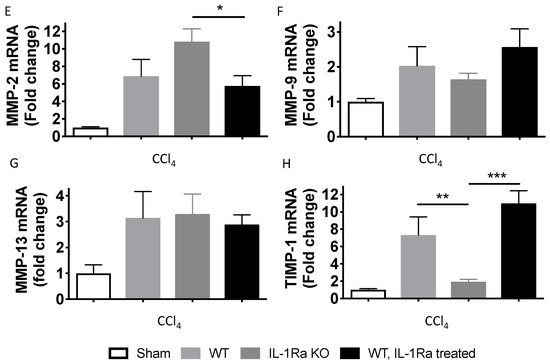 We further analyzed MMP-2, MMP-9, MMP-13 and tissue inhibitor of matrix metalloproteinases 1 (TIMP-1) hepatic gene expressions after BDL- and CCl-4-induced liver fibrosis using RT-PCR (Figure 7). In the BDL model, MMP-2, 9,13 and TIMP-1 levels were all higher in the WT mice group compared to the IL-1Ra KO mice group or WT mice treated with IL-1Ra (Figure 7A–D). In the CCl-4 model, MMP-2 and MMP-13 were higher in the IL-1Ra KO mice group compared to the two other groups (Figure 7E,G). Regarding MMP-9 and TIMP-1, expression was decreased in the IL-1Ra KO mice group compared to the two other groups (Figure 7F,H). Comparison between WT and KO baseline α-SMA mRNA levels in sham animals without fibrosis induction is provided in Supplementary Figure S3. These results confirm that IL-1Ra regulates genes in a model specific-manner during liver fibrosis.