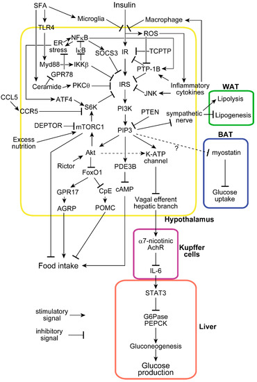 ATF4 (activating transcription factor 4) is reportedly an ER stress-responsive target, which induces leanness and enhanced insulin sensitivity when deleted [94]. Hypothalamic overexpression of ATF4 induces hepatic insulin resistance, which is reversed by the inhibition of hypothalamic S6K. On the other hand, suppression of hypothalamic ATF4 reverses ER stress-induced hepatic insulin resistance. This report shows that the hypothalamic ATF4–S6K pathway is responsible for ER stress-induced hypothalamic insulin resistance, which results in hepatic insulin resistance. A chemokine, CCL5/RANTES, activates CCR5 and reportedly decreases serine phosphorylation of IRS-1 in the hypothalamus by suppressing S6K [95]. Blocking CCL5/RANTES–CCR5 by genetic deletion or ICV injection of an antagonist inhibited hypothalamic insulin signaling and insulin resistance, indicating that this chemokine has a role in suppressing S6K-mediated negative feedback input to insulin signaling.