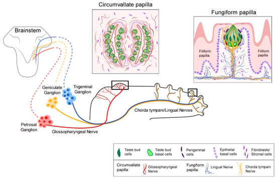 - von Vintschgau, M.; Honigschmied, J. Nervus glossopharyngeus und Schmeckbecher. Pflügers Arch. 1876, 14, 443–448. [Google Scholar] [CrossRef]