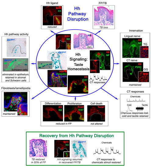 Summary of effects as follows: Hh Signaling Regulation in Taste Homeostasis; Hh Pathway Disruption; and, Recovery from Hh Pathway Disruption. Blue Circle, Inside: Hh signaling regulation in maintaining taste organs and sensation. Hh Signaling in Taste Homeostasis is illustrated in the fungiform papilla taste organ (FP), taste bud (TB), and Shh ligand (top); papilla and taste bud innervation and chorda tympani (CT) neurophysiological responses (right); taste organ cell functions (bottom); connective tissue fibroblasts (bottom left); and Hh pathway activity in papilla epithelium and stroma (left). Blue Circle, Outside: Effects of Hh Pathway Disruption by genetic suppression or pharmacologic inhibition. With Hh Pathway Disruption, blue arrows followed from the top and proceeding clockwise, there is the following: taste bud loss and associated reduction of Shh ligand (top); maintained innervation and ganglion neurons; elimination of taste responses but retained responses to cold and touch; reduced cell proliferation, compromised differentiation with unaltered cell death; sustained fibroblast/lamellipodia activity; and, loss of Hh signaling in the papilla epithelium, but retention in the connective tissue core. Green Box: Recovery from Hh Pathway Disruption. The following occurs after pathway disruption is discontinued: TB are restored in about 55% of FP; Hh signaling is resumed in epithelium of recovered FP; and, taste responses are restored. (Results in the figure are drawn principally from hematoxylin and eosin staining, immunohistochemistry, X-gal staining, and electrophysiology. Effects are illustrated with the FP/TB but apply also to the circumvallate papilla and taste buds). Some of the images for Taste homeostasis (inside Blue Circle), Hh pathway disruption (outside of the Blue Circle), and the entire Recovery panel (Green Box) are extracted from Figures in Kumari et al. 2017 [6] with permission. Scale bar in H&E image within the blue circle applies throughout.4.2. Hh Signaling Disruption with Genetic Models.