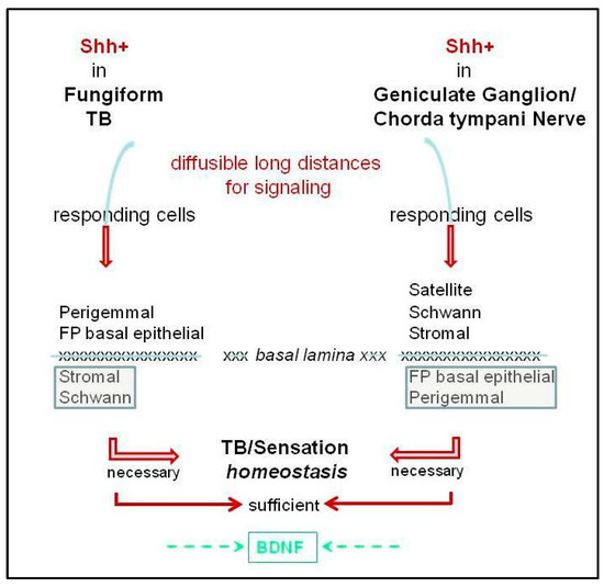 The Hh pathway is active in regulating peripheral taste organs, the gustatory papillae, taste buds, and neural responses/sensory function. There is ample evidence that Hh signaling is essential for maintaining TB, FP morphology, and taste sensation, but not lingual touch or cold sensation (Figure 2 and Figure 3). On the other hand, it is clear that taste innervation is necessary for TB maintenance and regeneration and a specific role for Shh-positive nerve fibers in sustaining TB has been presented [3,4]. We propose that an intact lingual epithelium and an intact innervation each is necessary but only both together are sufficient for TB homeostasis and sensation (Figure 4) and their functions are not redundant.