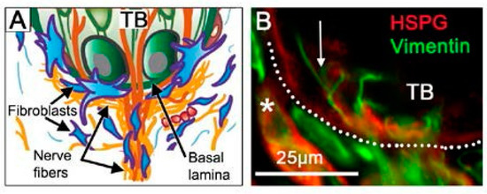 Basal lamina niche region under the taste bud and at the apex of the fungiform papilla connective tissue core. (A) Diagram for structural interactions among nerve fibers, fibroblasts and lamellipodia, and taste bud (TB) cells, at the basal lamina (Adapted from Figure 4 in Mistretta and Kumari (2017) [13] with permission) (B) Photomicrograph of basal lamina (HSPG immunoreaction, red) under TB cells with lamellipodia extensions (arrow) across the basal lamina from fibroblasts (Vimentin immunoreaction, green). The dotted line demarcates the basal epithelium. The asterisk denotes labelling of blood vessel basal lamina. We propose that Shh is sequestered at the basal lamina in this niche region.