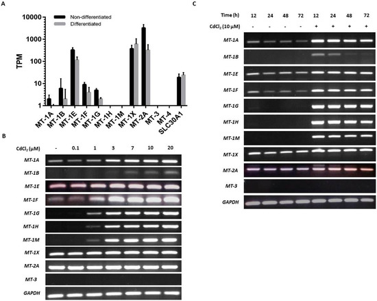 - Kheradmand, F.; Nourmohammadi, I.; Modarressi, M.H.; Firoozrai, M.; Ahmadi Faghih, M.A. Differential Gene-Expression of Metallothionein 1M and 1G in Response to Zinc in Sertoli TM4 Cells. Iran Biomed. J. 2010, 14, 9–15. [Google Scholar] [PubMed]