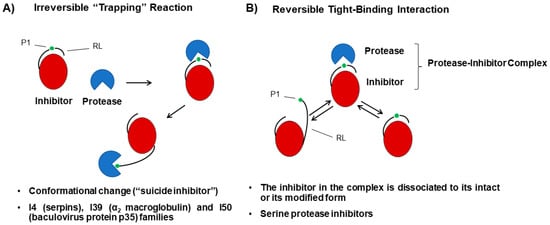 Mechanisms of protease-inhibitor interactions. (A) Irreversible “trapping” reactions. The protease–inhibitor interaction induces the cleavage of an internal peptide bond in the inhibitor triggering a conformational change. This reaction is not reversible, and the inhibitor never recovers its initial structure. For this reason, the inhibitors that participate in trapping reactions are also known as suicide inhibitors. The inhibitors never recover the initial structure. (B) Reversible tight-binding interactions. The inhibitor interacts with the protease active site in a similar way to the enzyme-substrate interaction. The protease-inhibitor complex co-exists in a stable equilibrium among the intact form of the inhibitor and the modified forms of the inhibitor where the peptide bond of the reactive site is cleaved. Therefore, the inhibitor in the complex is dissociated to its intact or its modified form. P1: PI reactive site; RL: reactive loop.
