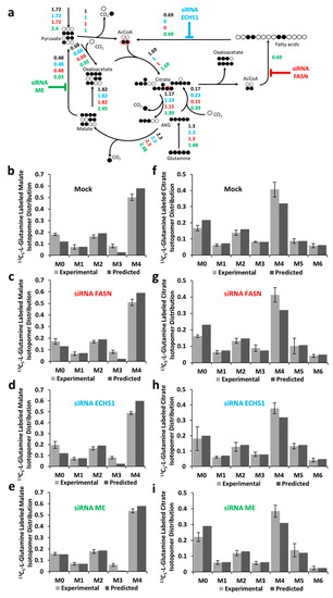 The experimental and fitted isotopomer distributions for malate and citrate in “control/reference” experimental conditions and after siRNA silencing are shown in Figure 2b–i, respectively. Reduced fractions of M6 citrate isotopomers indicate reduced FAS, FAO, or ME activity. The isotopomer distributions of malic acid are mainly determined by the rate of glutaminolysis and are not expected to be modified by changes in FAS, FAO, and ME activities.