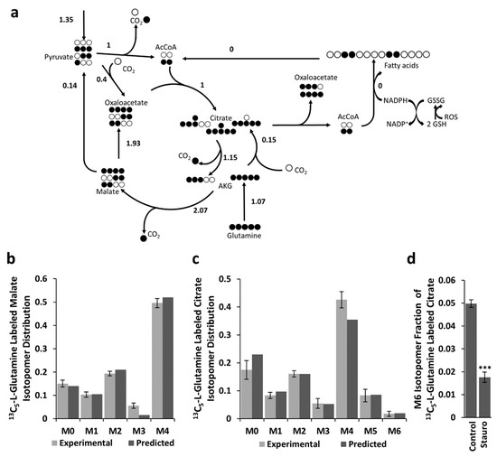 Estimated metabolic flux distributions and labeling patterns (simulated and experimentally observed) of malate and citrate for BCCs after treatment with staurosporine. (a) Estimated metabolic flux distributions for BCC cells treated with staurosporine. Simulated and observed labeling patterns of malate (b) and citrate (c) for BCCs treated with staurosporine. Error bars are 95% confidence intervals (n = 4). Drop of the fraction of M6 citrate caused by staurosporine (d). Bar graphs represent mean ± SEM (n = 4), *** p < 0.001.