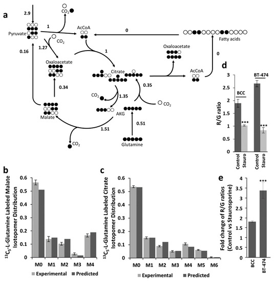 Estimated metabolic flux distributions and labeling patterns (simulated and experimental) of malate and citrate for BT-474 cells. (a) Estimated metabolic flux distributions for BT-474 cells. Simulated and observed labeling patterns of malate (b) and citrate (c). Error bars represent 95% confidence intervals (n = 4). (d) Staurosporine-induced mitochondrial depolarization in BT-474 and BCC cells. (e) Fold change of R/G ratios in BCC and BT-474 cells after staurosporine treatment. Bar graphs represent mean ± SEM (n = 4), *** p < 0.001.