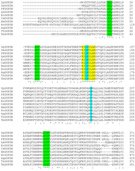 Multiple alignments of glucose 6-phosphate dehydrogenase (G6PD) sequences. SpG6PD1 (Sphingomonas sp. PAMC 26621), SeG6PD (Sphingomonas elodea [20]), PfG6PD (Pseudomonas fluorescens [21]), LmG6PD (Leuconostoc mesenteroides [5]), HmG6PD (Human [22]), EcG6PD (Escherichia coli [23]), CdG6PD (Camelus dromedarius [24]), HvG6PD (Hordeum vulgare [25]), AqG6PD (Aquifex aeolicus VF5 [7]), TtG6PD (Thermoanaerobacter tengcongensis [6]), TmG6PD (Thermotoga maritima [26]). Catalytic residues Asp174, His175, and His237 (turquoise color), the substrate-binding motifs (yellow color), cofactor-binding pockets (green color).