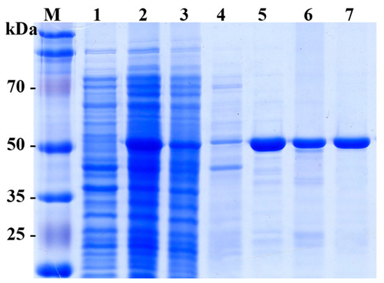 SDS-PAGE analysis of expression and purification of SpG6PD1. M: molecular weight marker, lane 1: control (uninduced cell), lane 2: cell lysate, lane 3: flow-through, lane 4: wash, lane 5–6: eluted fractions from HisTrap column, lane 7: eluted fraction from Q-Sepharose column.