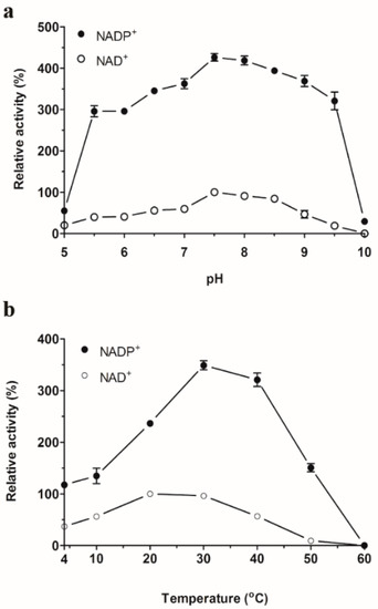 The optimal pH of SpG6PD1 was determined to be between pH 7.0–8.5 in both NADP+-linked and NAD+-linked reactions, with the highest activity observed at pH 7.5 (Figure 3a). This optimal pH range of SpG6PD1 is similar to other G6PDs [6,10,27]. SpG6PD1 displayed optimal temperatures at 30 °C for NADP+-linked reactions and 20 °C for NAD+-linked reactions (Figure 3b); these temperatures are higher than the physiological growth temperature of 15 °C for Sphingomonas sp. PAMC 26621, which is a feature often found in cold-adapted enzymes [28].
